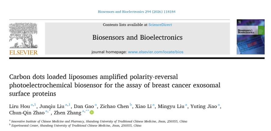 近日,中医药创新研究院张振教授团队在国际知名期刊Biosensors and Bioelectronics(中科院1区Top,IF:10.5)发表题为“Carbon dots loaded liposomes amplified polarity-reversal photoelectrochemicalbiosensor for the assay of breast cancer exosomal surfaceproteins”的研究论文,我院硕士研究生侯丽茹和刘君秋为共同第一作者,赵春芹老师和张振教授为论文通讯作者,山东中医药大学为论文第一单位。